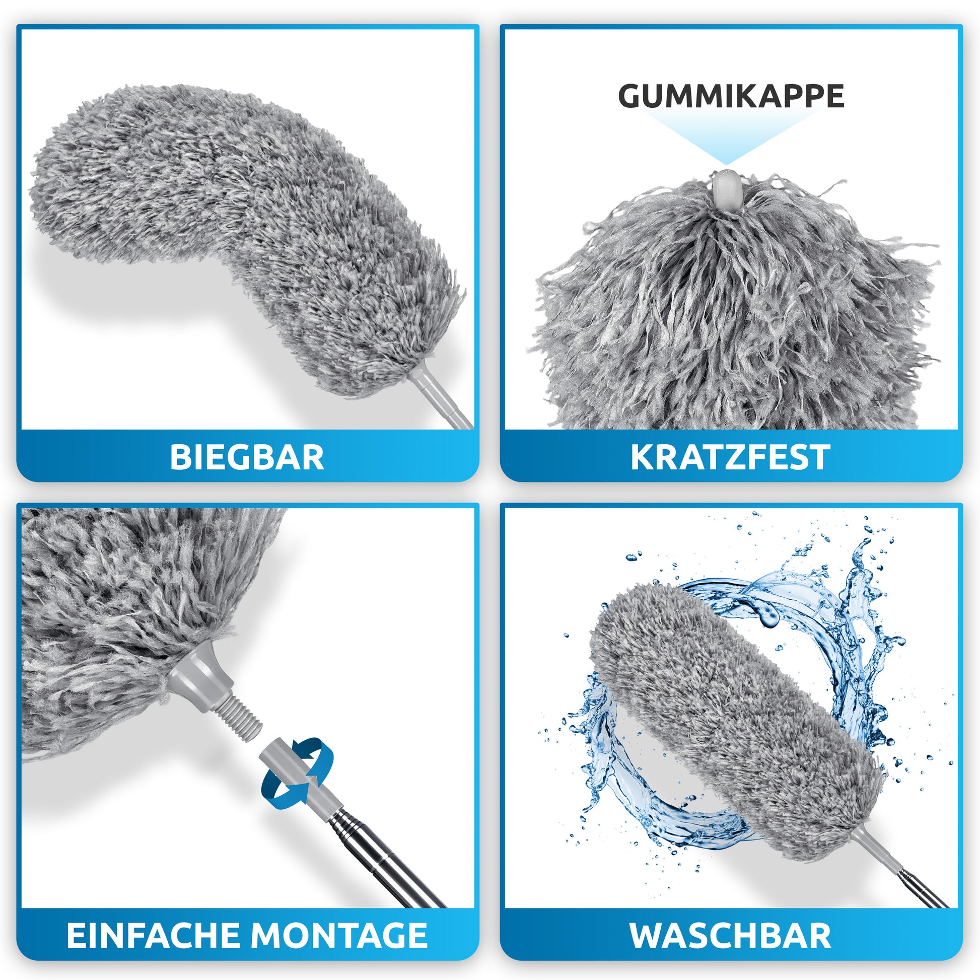 Der Kopf unseres Spinnenwebenentferner ist biegsam, sodass Sie auch die schwierigsten Ecken und die Kanten Ihrer Gardinenstangen von Staub befreien können. Eine Gummikappe an der Spitze des Staubtuchs verhindert das verkratzen von Oberflächen.